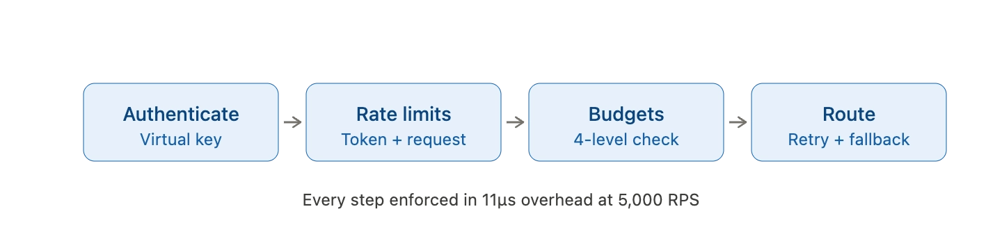 Every step happens in the 11-microsecond overhead window at 5,000 RPS, so the policy layer does not become the new bottleneck. Teams evaluating gateways for production traffic can review the LLM Gateway Buyer's Guide for a full capability matrix across performance, governance, and reliability dimensions.