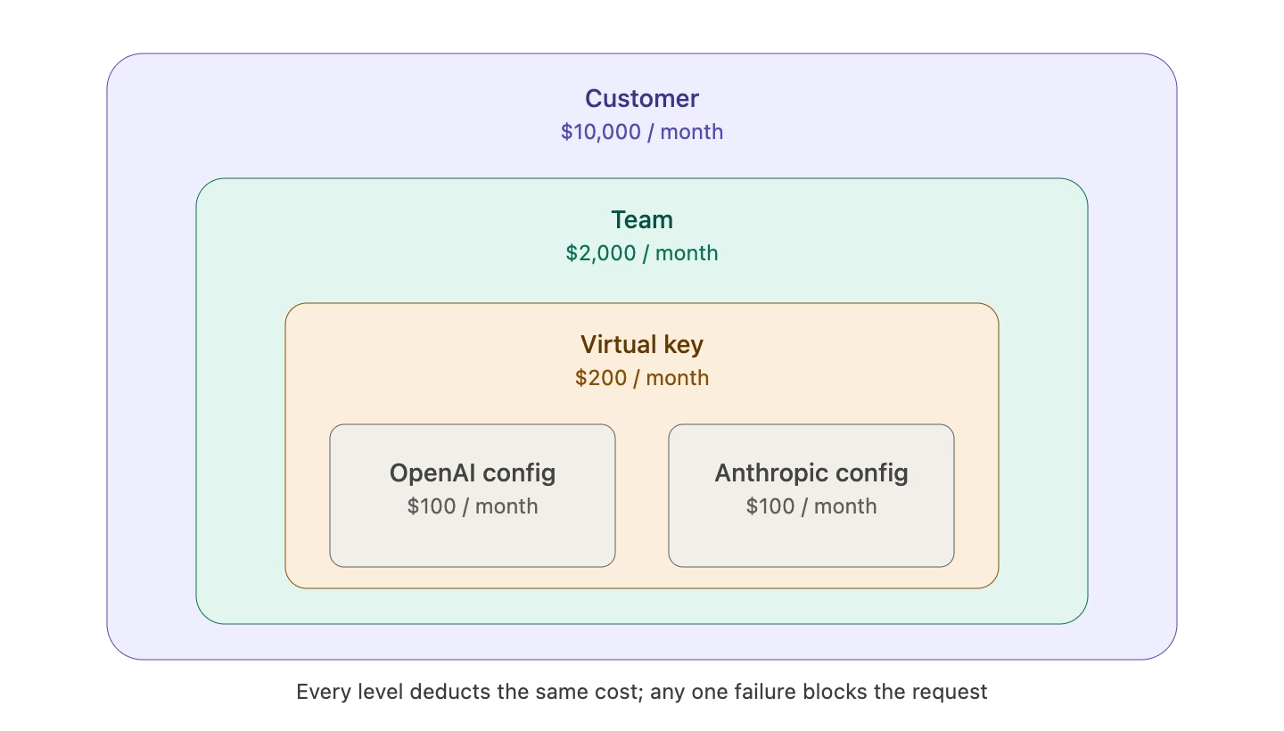 - Check budgets at the provider-config level, then the virtual key, then the team, then the customer.